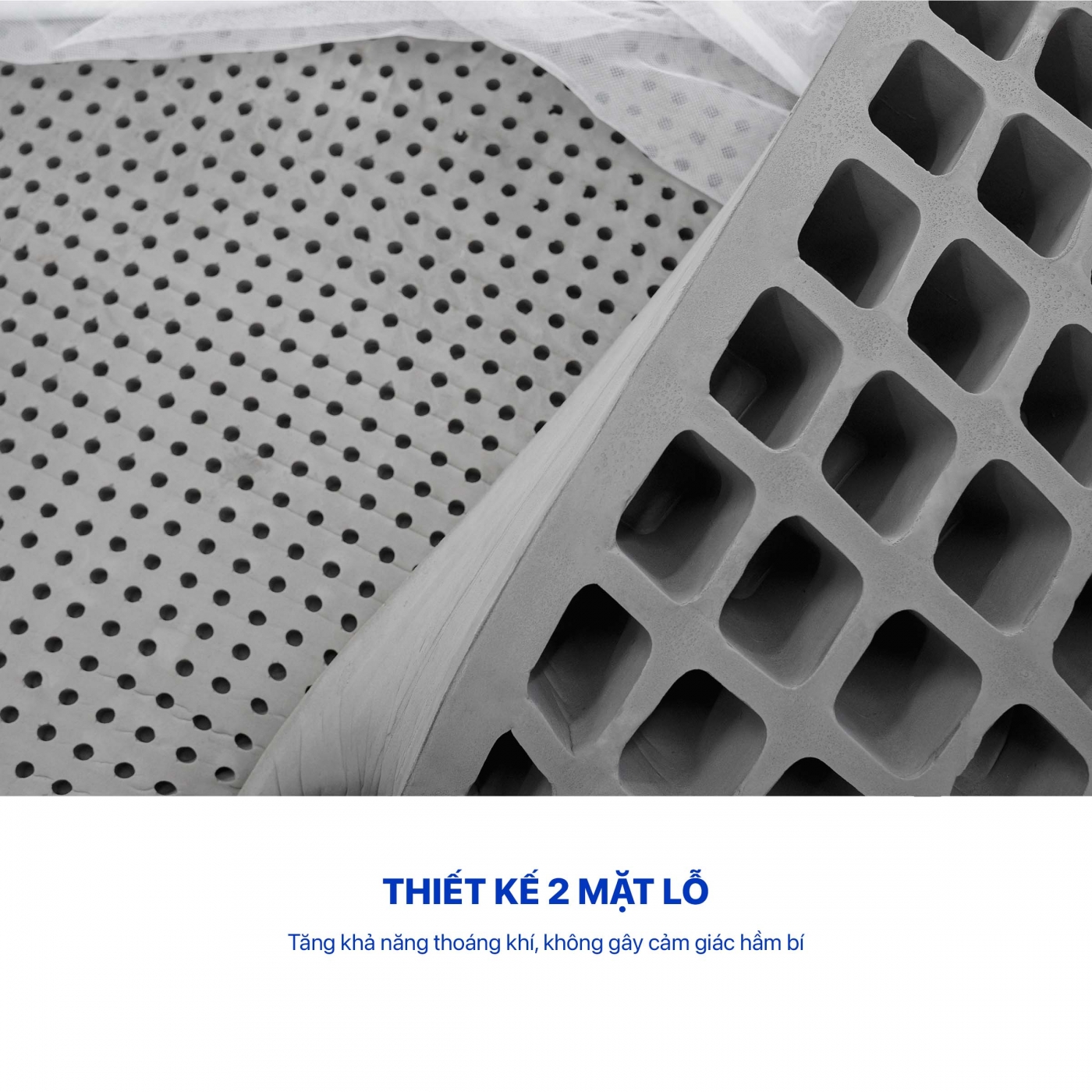 - Mặt nệm bố trí hệ thống lỗ thoáng khí kép đôi lưu trên dưới (mặt lỗ tròn phía trên, mặt lỗ tròn đều phía dưới).